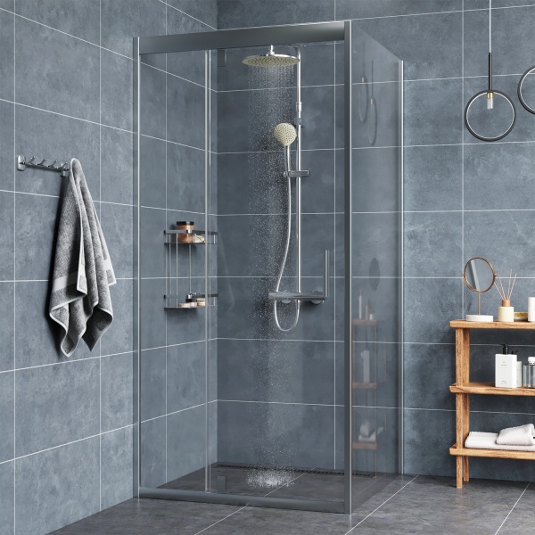 Прозрачное закаленное стекло толщиной 5 мм и тонкий матовый профиль создает ощущение невесомости и визуально увеличивает пространство. Душевая система словно создана для вас: