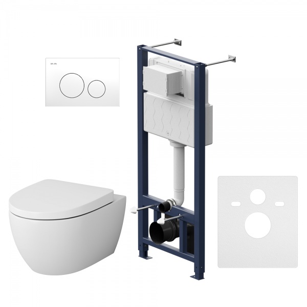 Полностью готовый к установке комплект: система инсталляции с клавишей  подвесной унитаз с сиденьем. Не разборная рама из стального профиля выдерживает нагрузку до 400 кг. Полностью изолированный бачок с качественной двухрежимной смывной арматурой - комфортное использование благодаря низкому уровню шума - менее 20 Дб.