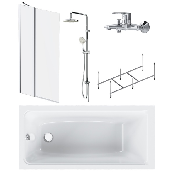 В комплект включены ванна на каркасе душевая шторка с поворотной дверью и фиксированным стеклом а также душевая система со смесителем для ванны и душа.
