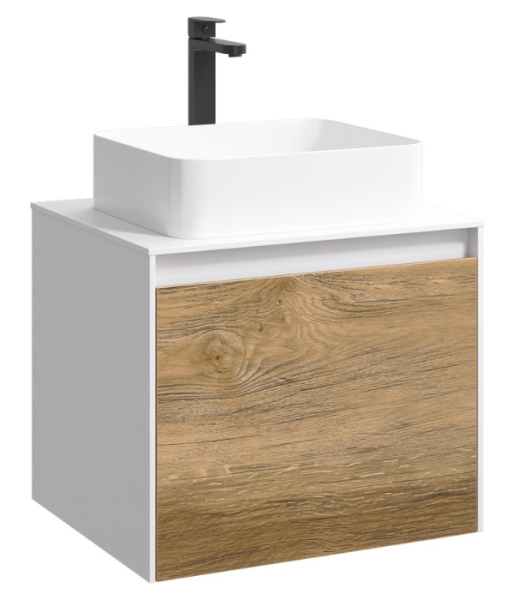 Подвесная тумба 60 см с двумя ящиками: основной и внутренний, скрытый за фасадом. Цвет белый/дуб балтийский; с умывальником