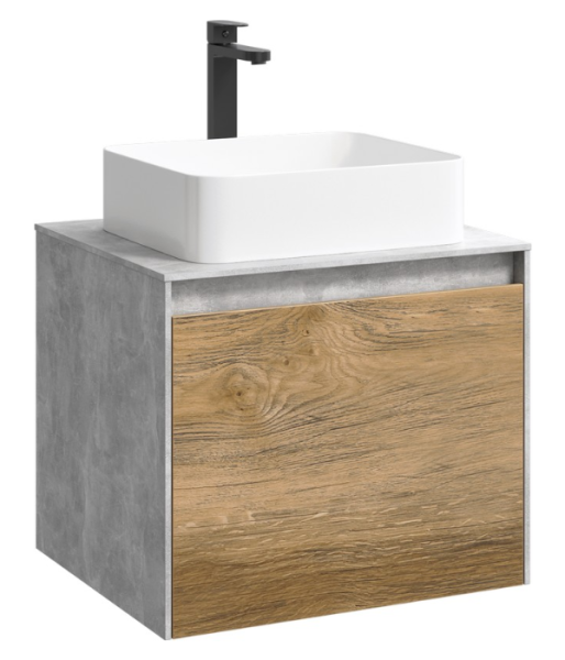 Подвесная тумба 60 см с двумя ящиками: основной и внутренний, скрытый за фасадом. Цвет бетон светлый/дуб балтийский; с умывальником
