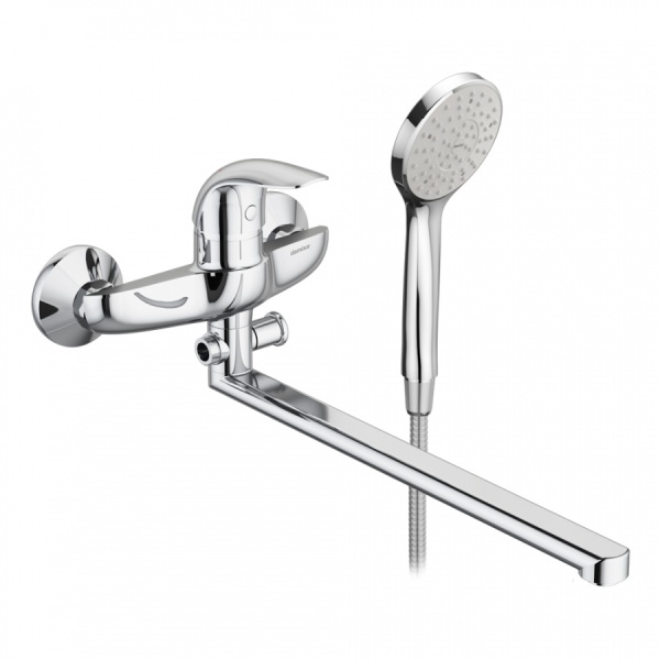 Классический вариант смесителя для ванны и душа будет аккуратно смотреться в интерьере из-за округлых форм и сглаженных углов. Длинный излив смесителя поможет справится с рядом бытовых задач  его длина составляет 387 мм.