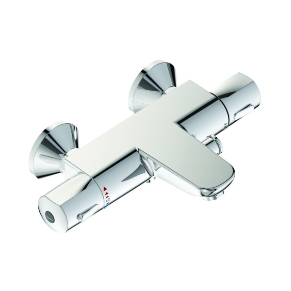 V-STYLE Настенный термостатический смеситель для ванны/душа, монтаж на стандартных эксцентриках, термостатический картридж, затворы на керамических дисках G1/2 180˚, без душевого гарнитура, пластиковые рукоятки с ограничителями температуры (40ºC) и потока воды (50%), встроенный обратный клапан
