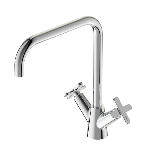 VIDIMA ART Смеситель для кухонной мойки, система монтажа EASY-FIX (облегченный монтаж), трубчатый поворотный излив, длина излива 230 мм, угол поворота 360˚, аэратор PERLATOR, керамические кранбуксы производства Германии с поворотом 180˚, металлические рукоятки, индикатор холодной/горячей воды, гибкая подводка G3/8", переходник на 1/2" в комплекте, удлиненные шланги 550 мм, дополнительная пластиковая монтажная накладка для лучшей установки на стальной мойке