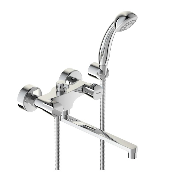 VIDIMA NEO Смеситель для ванны/душа, с керамическим переключателем, монтаж на стандартных эксцентриках (в комплекте: эксцентрики, металлические отражатели, уплотнительные прокладки), трубчатый поворотный излив, длина излива 250 мм, от стены 313 ÷ 317, угол поворота 360˚, аэратор PERLATOR, керамические кранбуксы производства Германии с поворотом 180˚, металлические рукоятки, индикатор холодной/горячей воды, переключение ванна/душ - ручной керамический переключатель, душевой гарнитур в комплекте (душевая лейка Ø70 мм, металлический шланг 1500 мм, держатель для лейки)