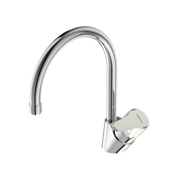 VIDIMA NEXT Смеситель для кухонной мойки, cистема облегченного монтажа StrongFix®, трубчатый поворотный излив, длина излива R 200 мм, угол поворота 360˚, аэратор PERLATOR, новый керамический картридж IS 40 мм, с функцией HWTC (ограничение максимальной температуры горячей воды), без функции CLICK, металлическая рукоятка, индикатор холодной/горячей воды, гибкая подводка G3/8", переходник на 1/2" в комплекте, удлиненные шланги 550 мм, без донного клапана