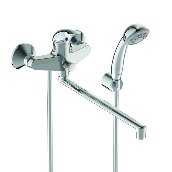 ORION Однорукоятковый настенный смеситель для ванны/душа, монтаж на стандартных эксцентриках (в комплекте: эксцентрики, металлические отражатели, уплотнительные прокладки), трубчатый поворотный излив 320 мм, угол поворота 360˚, аэратор PERLATOR, керамический картридж 35 мм, металлическая рукоятка, индикатор холодной/горячей воды, ручное переключение ванна/душ, душевой гарнитур в комплекте (душевая лейка Ø70 мм, металлический шланг 1500 мм, держатель для лейки)