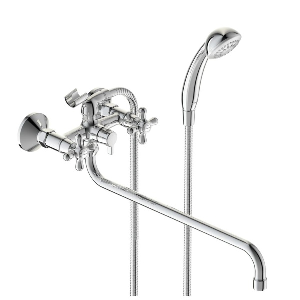 RETRO Смеситель для ванны/душа, с керамическим переключателем, монтаж на стандартных эксцентриках (в комплекте: эксцентрики, металлические отражатели, уплотнительные прокладки), трубчатый поворотный излив, длина излива S 400 мм, от стены 459 ÷ 464, угол поворота 360˚, аэратор PERLATOR, керамические кранбуксы производства Германии с поворотом 180˚, металлические рукоятки, индикатор холодной/горячей воды, переключение ванна/душ - ручной керамический переключатель, душевой гарнитур в комплекте (душевая лейка Ø70 мм, металлический шланг 1500 мм, держатель для лейки)
