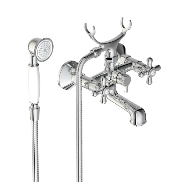 RETRO Смеситель для ванны/душа, с керамическим переключателем, монтаж на стандартных эксцентриках (в комплекте: эксцентрики, металлические отражатели, уплотнительные прокладки), литой поворотный излив, длина излива 90 мм; от стены 149 ÷ 154, аэратор PERLATOR, керамические кранбуксы производства Германии с поворотом 180˚, металлические рукоятки, индикатор холодной/горячей воды, переключение ванна/душ - ручной керамический переключатель, душевой гарнитур в комплекте (душевая лейка RETRO Ø55 мм, металлический шланг 1500 мм, держатель для лейки)